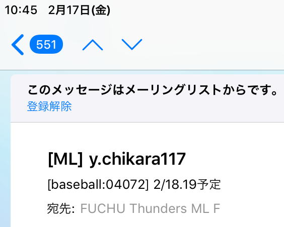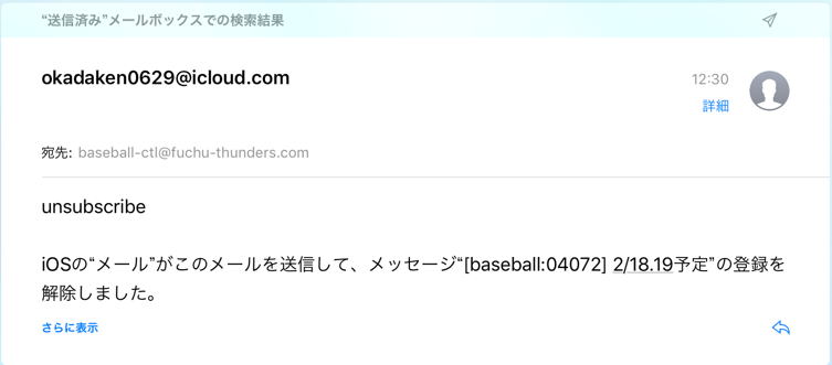 あれ? 押した(触れた)かな?と思ったら、“送信済み”メールボックスを確認して下さい。 次のような送信履歴があれば、一斉メールの配信が解除されています。 ![]() ⇒今後、一斉メールが不要の方は、特に処置は不要です。 ⇒引き続き、一斉メールを受信したい方は、『受信したいメールアドレス、選手氏名、間違って配信設定を削除してしまった旨』を記載の上、 sanka@fuchu-thunders.com 宛に送信して下さい。 |