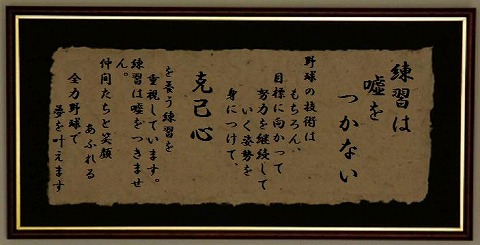 ![]() 府中サンダース基本ルール 1.集合時間前に余裕をもって来る 2.大きな声で挨拶をする 3.荷物・道具をきれいに並べる 4.率先して準備、あとかたづけをする 5.人の話を聞くときは注目し、大きな声で返事をする 6.グランド内は歩かない 7.練習・休憩の区別をきちんとつける 8.道具を投げない、またがない 9.ユニフォームをきちんと着用する 10.休むとき・遅れるときは必ず連絡する 守備の心得20ヶ条 1.当たり前のことを当たり前にプレーせよ 派手なプレー、ファインプレーに憧れるな。スタンドプレーは慎む。守備範囲のボールを確実にアウトにできる選手になる。自分のベストをつくす。 2.最後までボールから目を離すな 一瞬のスタート、ボールへの集中,「捕れるだろう」はダメ「捕った」まで。ゴロの場合の「アゴをひく」とはそういうこと 3.アウトカウントを忘れるな アウト数による守備位置の移動、スリーアウトは一塁でとる、というような試合のセオリーを大切にすることが野球には必要。アウト数を頭に入れないでプレーしているようでは野球選手としての資格はない。 4.常に次のプレーを頭に描いておけ 考える、予測する、集中して待つ→プレーに余裕がありミスが少ない。打球を捕った後どうしたらいいかを常に頭に描いておくこと 5.間に合わない所にボールを投げるな 日頃の練習で培う。周囲にいる選手の指示も大切。声を出す、声をかける 6.カバー・バックアップを忘れるな 万に一つの確率にでも備える。特に外野手の内野手バックアップが大切。試合のボールは一つしかない 7.失策を気にするな。仲間の失策には励ましの声を 死ぬまで野球をやっても、同じ打球を処理することはない。野球にエラーはつきもの、どんな名手にもエラーはある 8.声を出せ。指示を忘れるな 大きく声を出して気を高める。ゆずりあい、FC等「たった一声」が無かったために流れが変わる→敗戦 9.サインプレーを熟知しておけ 守備のサイン→高度なプレー。牽制、トリックプレー等、選手自身が作っていく 10.守備の最大の目標はアウト数を増やすこと 3つアウトを獲ること以外にない。チーム全員がその目標をもって試合に臨む 11.守備とは9人で守ること 一つのボールに全員が動く。スキが無ければバッターに威圧感を与える 12.球を捕るときに走者を絶対に見てはならない エラーの最多原因は、球から目をきるため。 2と同じ、捕らなければ送球できない 13.守備の時間を早く切り上げる努力を 守備は長いと疲れる。攻撃に移っても集中力に欠ける。一人ひとりが、きちんと決めごとを守る努力を 14.遠投は必ずワンバウンドで送球せよ 外野からの返球、内野の深い位置からの送球は、ダイレクトでも悪送球では意味がない。ワンバウンド送球は恥ではない 15.挟殺プレーは若い塁に走者を追い込め 16.守備の時は守備以外の事を考えるな 外野で素振りのまね→集中してないと一瞬のスタートの遅れとなる 17.常に試合の状況を理解しておけ イニング、得点差、アウトカウント、守備位置、天候,試合進行状況の把握→サイン見逃しの防止 18.相手選手の特徴を早くつかもう コツは一度に多くを知ろうとしないこと。足、肩、気が強い弱い、攻めのパターン等 19.投手は9人目の野手 自覚すること。ベースカバー、バックアッププレーの動き 20.闘志を燃やせ ファイトのないプレーは野球のプレーではない。声を出して、投手の投げ込んだ球に集中して打球を待つ姿勢、その姿がファイトであり、打者に威圧感を与える攻めの守りである |