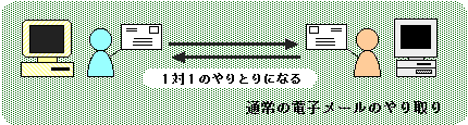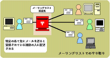 メーリングリスト(Mailing List)とは、電子メールを使ったインターネット活用法のひとつで複数の人に同じメールを配送できる仕組みのことです。メーリングリストは略して、ML(エムエル)と呼ばれています。 通常、電子メールを送るときは電話をかけるときと同様に相手に直接メールを送ります。文通などでは1対1でお互いメールの交換をし合うことになります。 ![]() メーリングリストでは、ある特定のあて先にメールを送ると、そのメールはあらかじめ登録されている人全員に配送されます。もし、送られてきたメールに返信をすればそのメールも登録されている人全員に送られるので、文通と異なり1対1ではなく複数同士でのメールのやり取りが実現できます。これがメーリングリストの最大の特徴です。 ![]() |